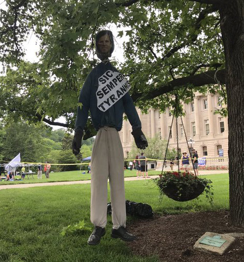 The effigy bore a sign saying “Sic semper tyrannis,” Latin for “Thus ever to tyrants,” the state motto of Virginia and the words John Wilkes Booth reportedly said after assassinating President Abraham Lincoln in 1865. “After hanging for a short time while people snapped photos,” Ladd reports, “it was cut to the ground.” But it brought objections from some protesters, and from politicians of both parties.
